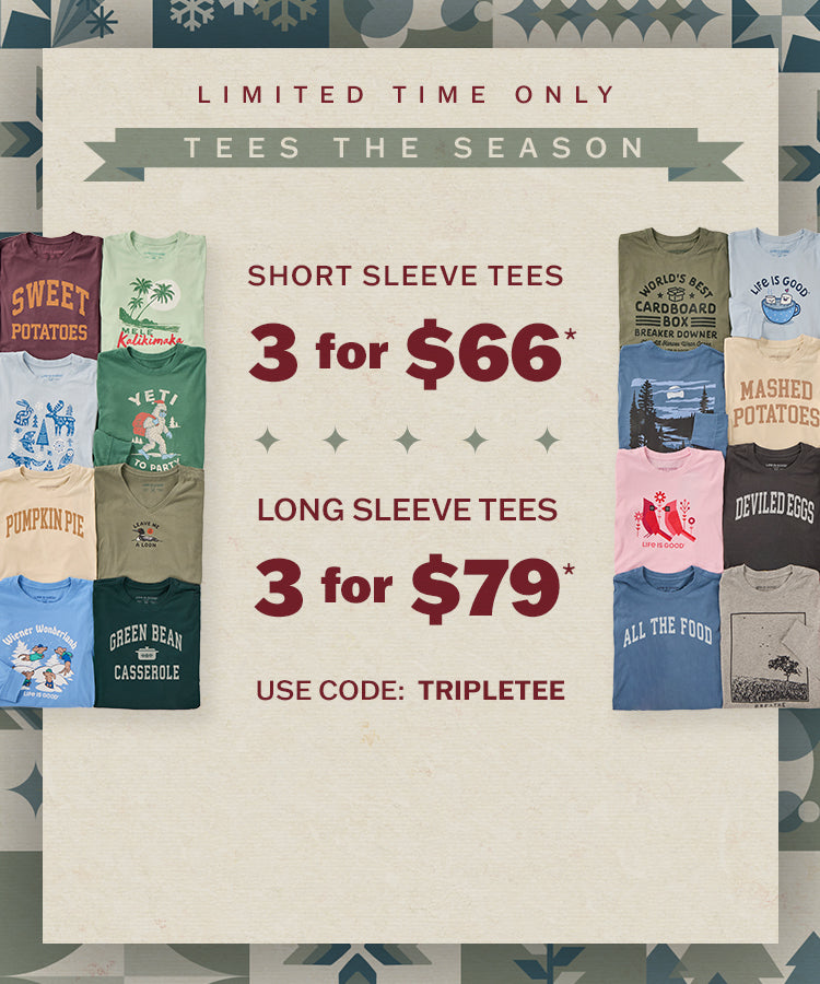 *Offer valid only at Lifeisgood.com through 11/15/2025 at 11:59 PM PT. Inclusive of Women's & Men's Short Sleeve Graphic Crusher & Crusher-LITE Tees, Men’s Graphic Slim Fit Tee, Women’s Graphic Boxy Tees, Women's Graphic Shrunken Tees and Customizer items. Short Not valid on Solid Tees, Long Sleeve Tees, Boxy LS Tees, Allover Tees, Embroidery Tees, Hooded Crusher-LITE, Active & Slub Tees, Tank Tops, Henley’s/Thermals, Polos, Sun Crusher, Modal, Tee Bundles, Sale items, or The Playmaker Project Giving Tee. Excludes sales tax and shipping. While supplies last. No adjustments will be made to previous or pending purchases. No cash value. Select products are excluded from the offer. Eligible items are limited to specific categories. Bundle items are subject to change. Void where prohibited or otherwise restricted. Valid in the U.S. and Canada only. This offer cannot be combined with any other offers.