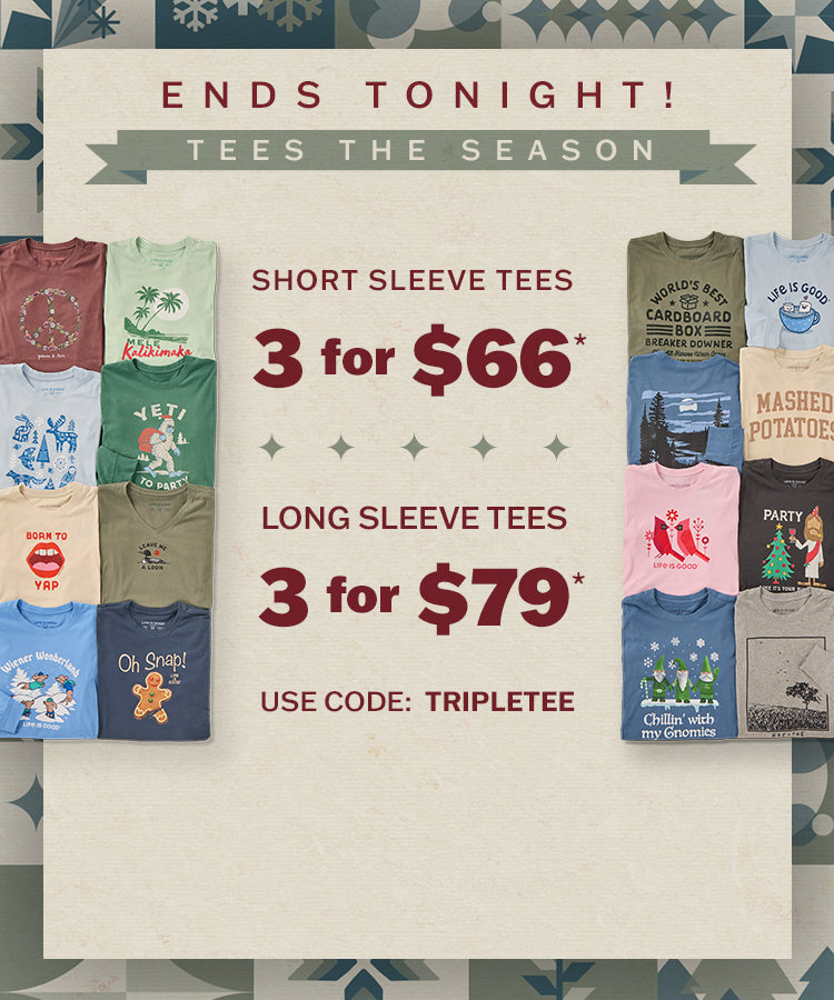 *Offer valid only at Lifeisgood.com through 11/15/2025 at 11:59 PM PT. Inclusive of Women's & Men's Short Sleeve Graphic Crusher & Crusher-LITE Tees, Men’s Graphic Slim Fit Tee, Women’s Graphic Boxy Tees, Women's Graphic Shrunken Tees and Customizer items. Short Not valid on Solid Tees, Long Sleeve Tees, Boxy LS Tees, Allover Tees, Embroidery Tees, Hooded Crusher-LITE, Active & Slub Tees, Tank Tops, Henley’s/Thermals, Polos, Sun Crusher, Modal, Tee Bundles, Sale items, or The Playmaker Project Giving Tee. Excludes sales tax and shipping. While supplies last. No adjustments will be made to previous or pending purchases. No cash value. Select products are excluded from the offer. Eligible items are limited to specific categories. Bundle items are subject to change. Void where prohibited or otherwise restricted. Valid in the U.S. and Canada only. This offer cannot be combined with any other offers.