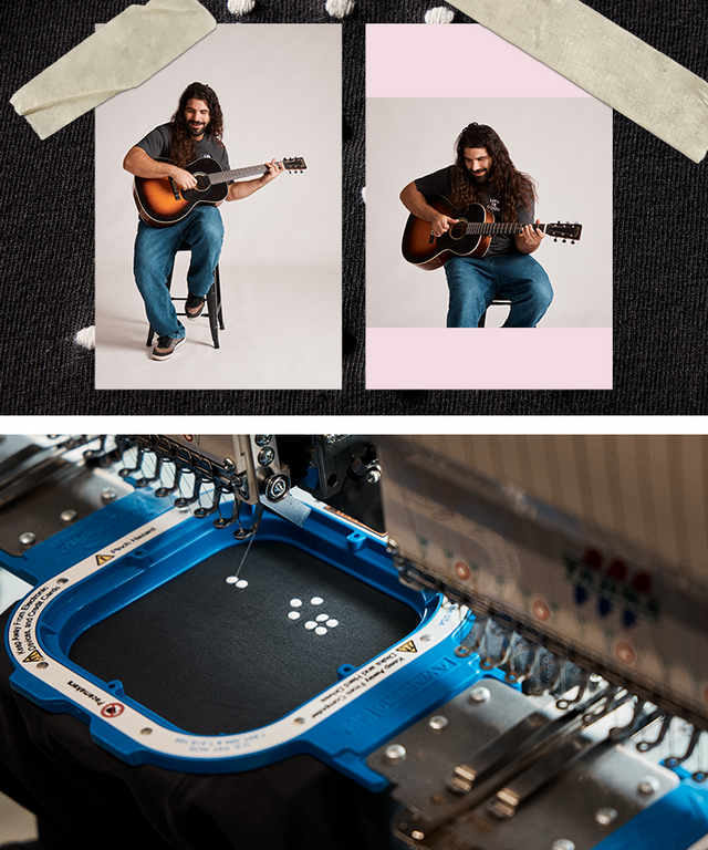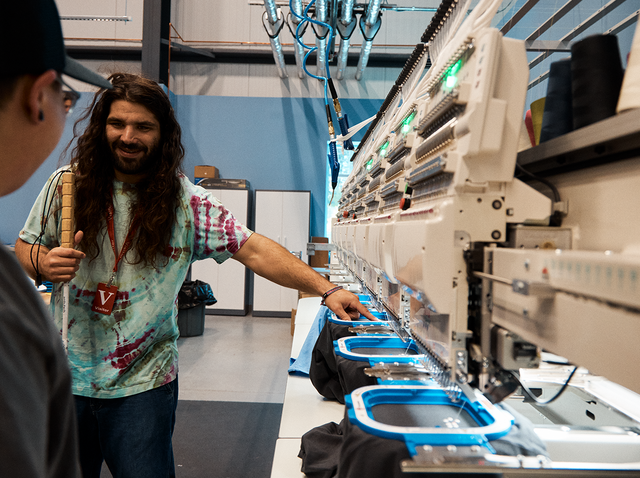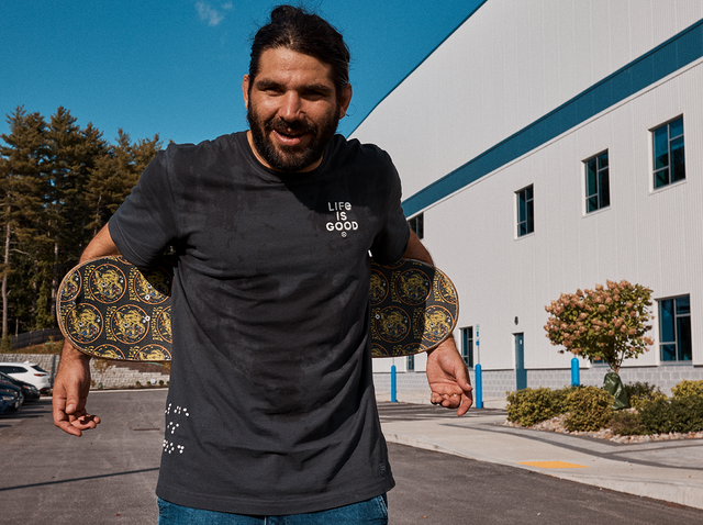 Anthony recently visited the Life is Good factory in Hudson, NH. With his guidance, we collaborated on a brand new tee — our first ever braille t-shirt. To create a raised, textured surface for braille characters, we utilized our embroidery machines, stitching the words "Life is Good" directly onto the shirt in an easy-to-touch location.