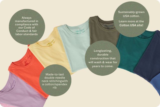 We’ve worked hard to build a t-shirt manufacturing process that fully reflects our respect for the planet and its people. When you wear a Life is Good tee, you can rest assured that we kept these values in mind through the product's entire lifecycle, starting with sustainably-grown cotton and finishing with a hangtag crafted from post consumer recycled material.