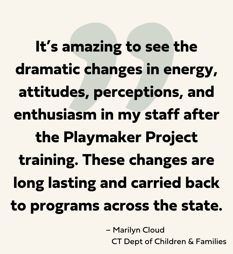 We’ve boiled down 30+ years of field experience into a 4-step framework for building healing, life-changing relationships and experiences with children. Through a thoughtful blend of play, teaching, and discussions, staff will experience the Playmaker approach in action and explore ways to enhance joyfulness, social connection, internal control, and active engagement in their own work with kids. They will then get to continue their journey online at Playmaker University and gain the additional knowledge and tools they need to tackle the children’s mental health crisis and help kids heal and learn through play.