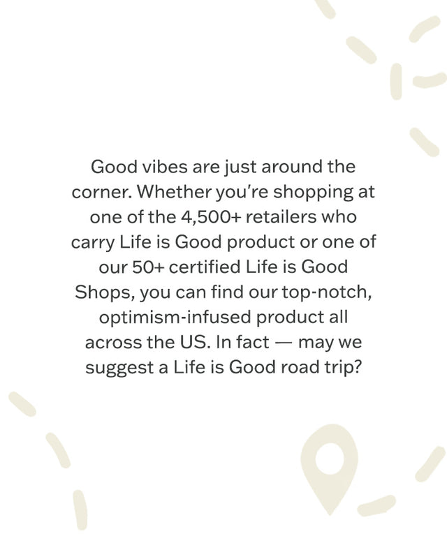 Use our Store Locator to find retail partners near you who carry our goods — and filter for Life is Good Shops to find our roster of independently-owned, Life is Good-branded stores where you can experience our mission and values at work.